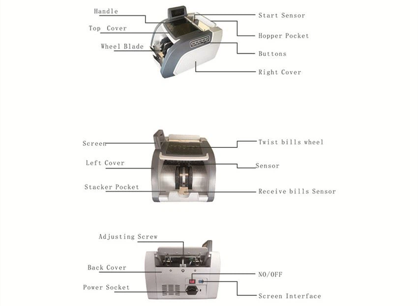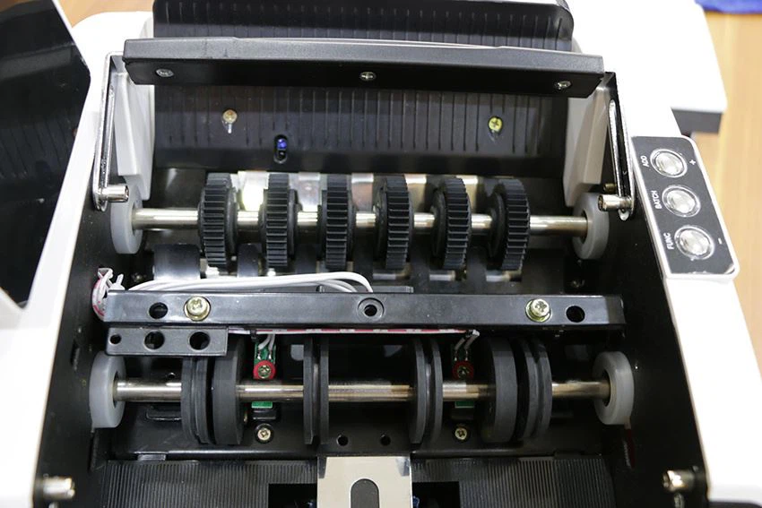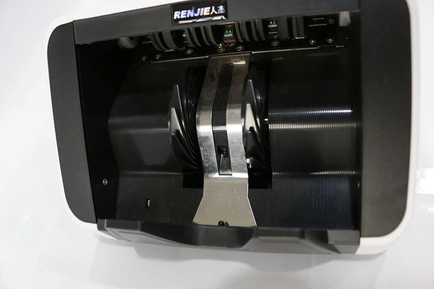 5. Wait no less than 5 seconds after shutting down the money counter before turning it on again, otherwise it may cause the machine to work abnormally. The dust on the counter tube and each sensor should be cleaned thoroughly once a week. Just lift the upper cover up and clean the dust with a brush. Please turn off the power before cleaning.